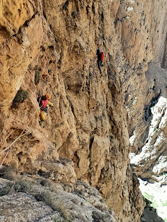 Con las mismas deshacemos la aprox y directamente nos dirigimos a la pared de las fuentes. Nos decidimos por algo más juguetón, la Susurro Bereber es la elegida. Viote que equiparon varios miembros del GREIM justo a la derecha de Zebda. Comienza con una super tirada de 7b+ que te deja temblando, 45 metros muy buenos. Un 6c le sigue, y este da paso a dos 7a+ que nos dejan más que satisfechos, tiradas guapas, técnica la primera y super física la segunda, memorables. Dejamos tres 6bs para otro día y ponemos reverso en polvorosa... los susurros de una buena cena nos acarician los oídos. Primer día bien aprovechado con otro viote super bien equipado que nos dejó muy buen sabor de boca, altamente recomendable!